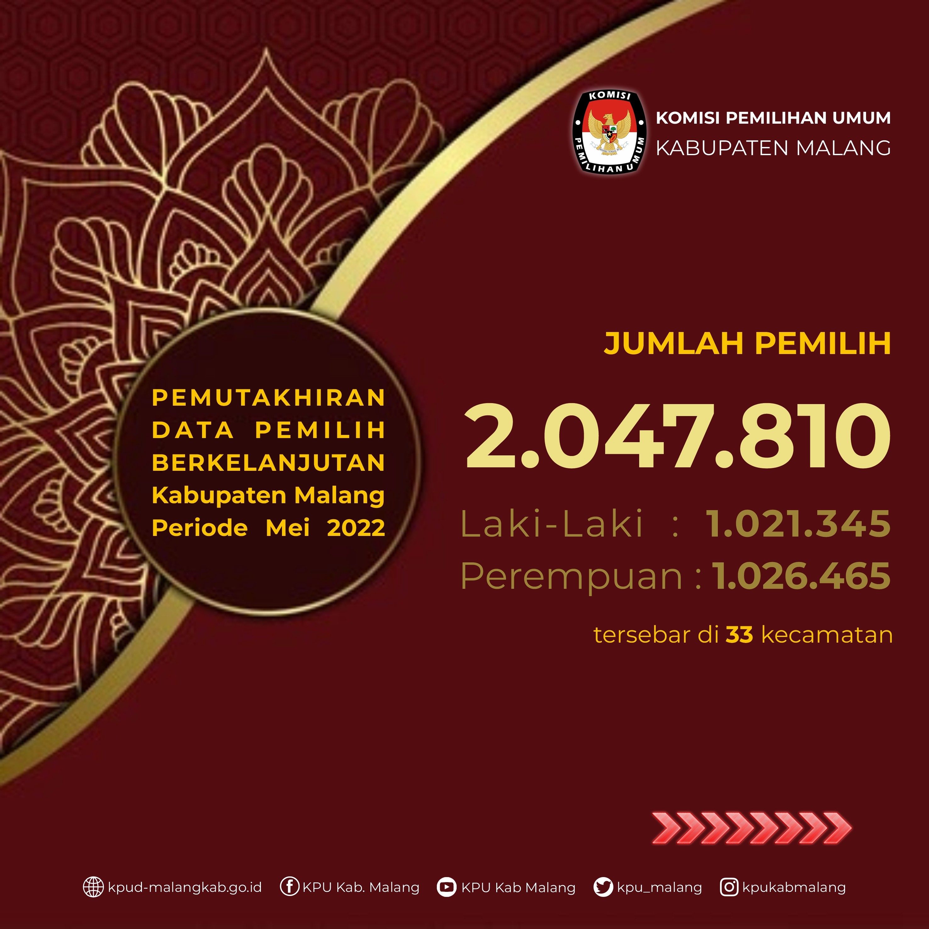 01. Rekapitulasi Daftar Pemilih Berkelanjutan dengan jumlah pemilih sebanyak dua juta empat puluh tujuh ribu delapan ratus sepuluh (2.047.810) pemilih, dengan rincian laki-laki berjumlah satu juta dua puluh satu ribu tiga ratus empat puluh lima (1.021.345) pemilih dan pemilih perempuan berjumlah satu juta dua puluh enam ribu empat ratus enam puluh lima (1.026.465) pemilih yang tersebar di tiga puluh tiga (33) kecamatan.