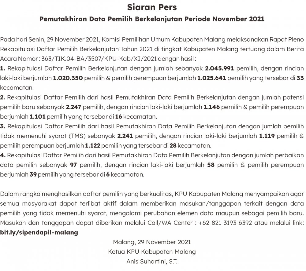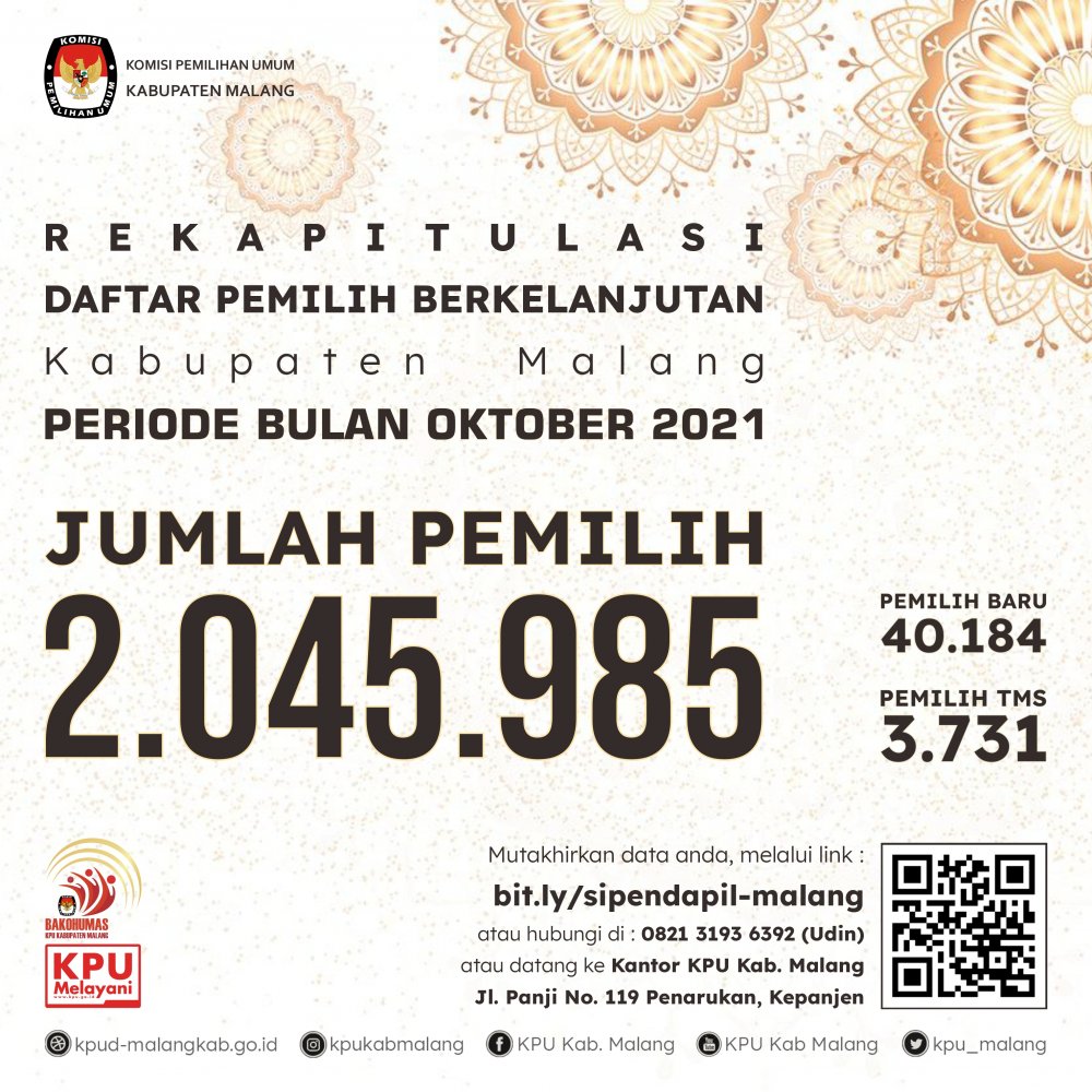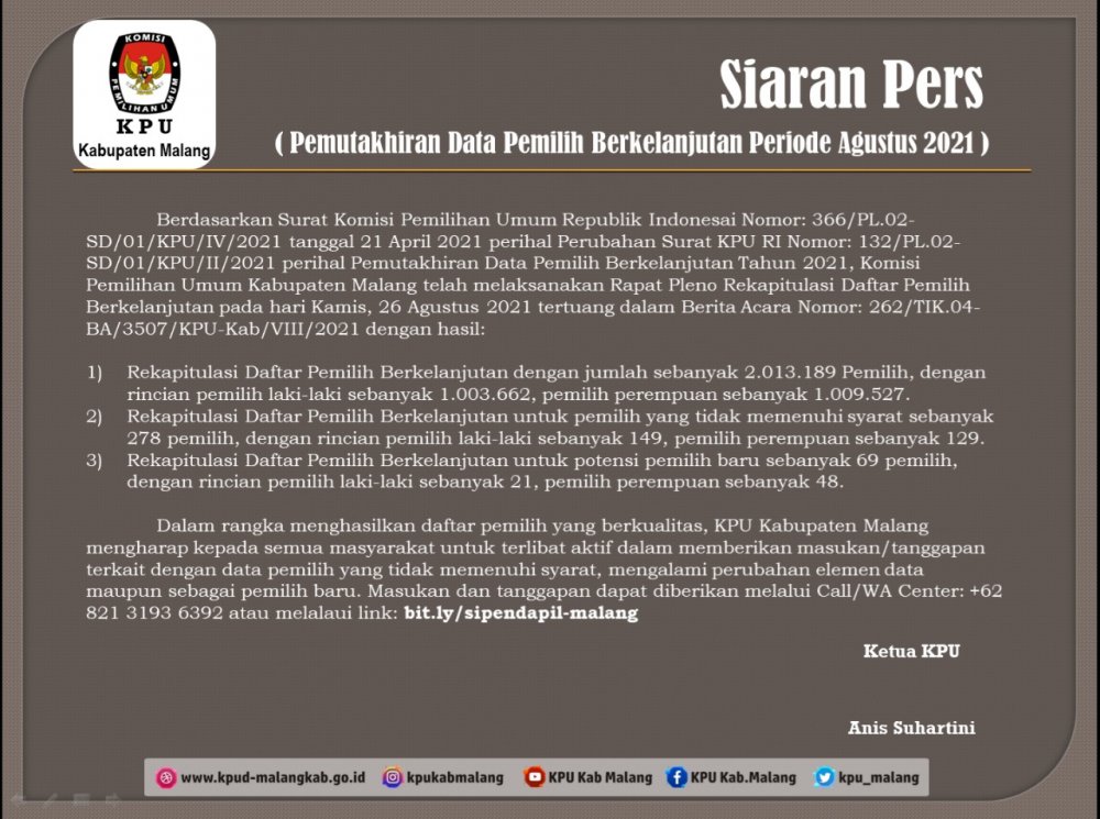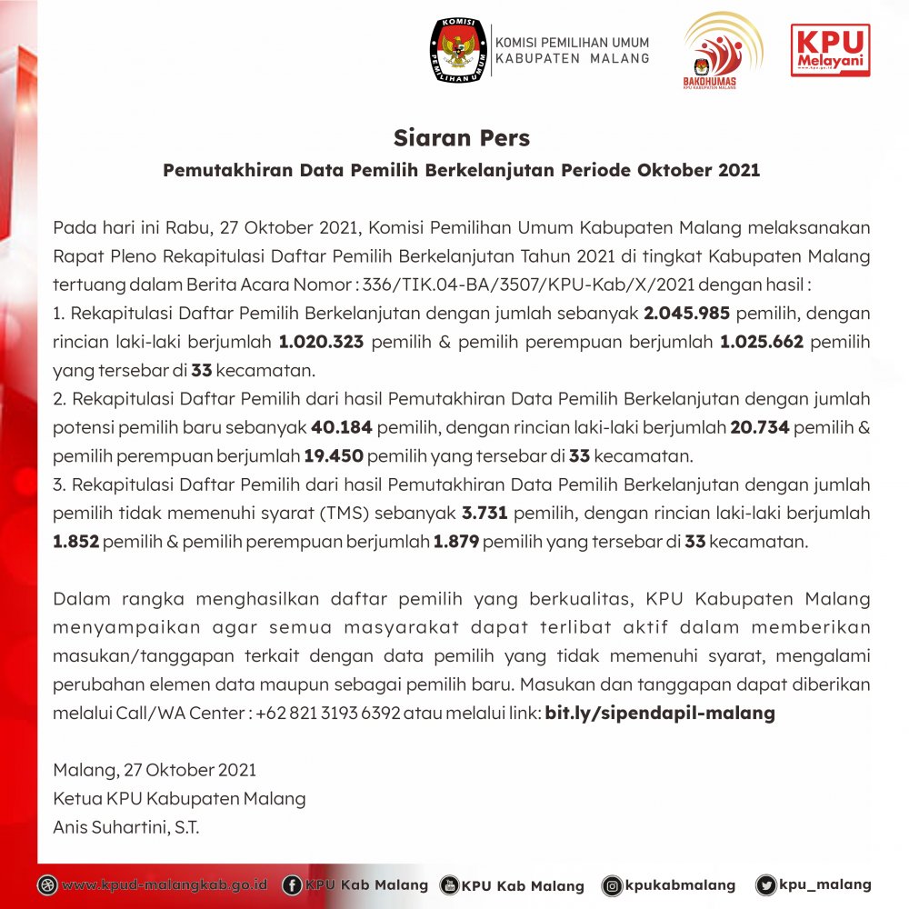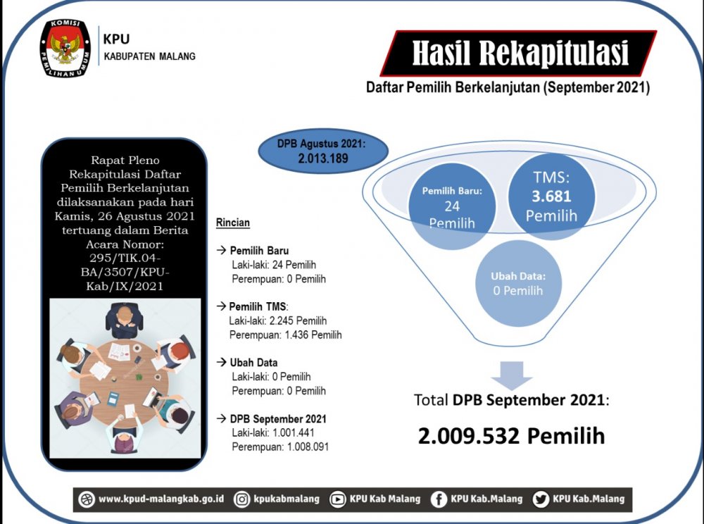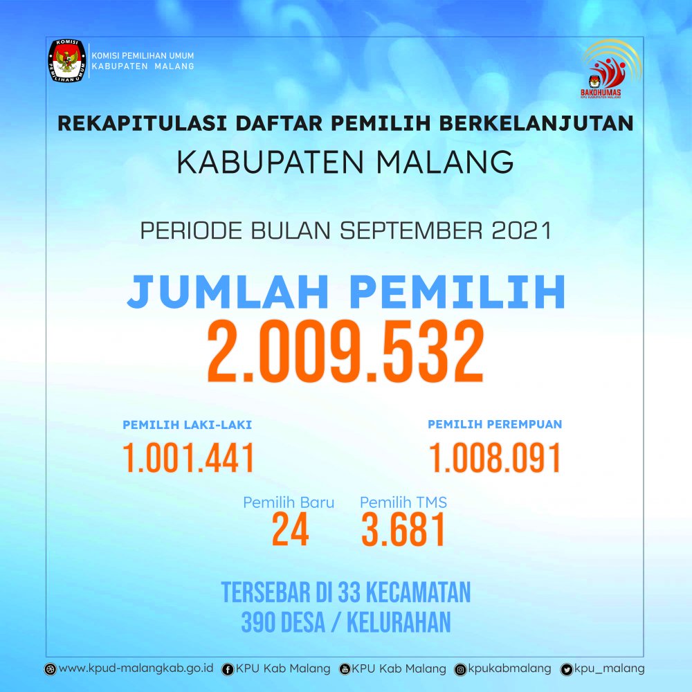 Pada hari ini Rabu, 27 Oktober 2021, Komisi Pemilihan Umum Kabupaten Malang melaksanakan Rapat Pleno Rekapitulasi Daftar Pemilih Berkelanjutan Tahun 2021 di tingkat Kabupaten Malang tertuang dalam Berita Acara Nomor : 336/TIK.04-BA/3507/KPU-Kab/X/2021 dengan hasil :1. Rekapitulasi Daftar Pemilih Berkelanjutan dengan jumlah sebanyak 2.045.985 pemilih, dengan rincian laki-laki berjumlah 1.020.323 pemilih & pemilih perempuan berjumlah 1.025.662 pemilih yang tersebar di 33 kecamatan.2. Rekapitulasi Daftar Pemilih dari hasil Pemutakhiran Data Pemilih Berkelanjutan dengan jumlah potensi pemilih baru sebanyak 40.184 pemilih, dengan rincian laki-laki berjumlah 20.734 pemilih & pemilih perempuan berjumlah 19.450 pemilih yang tersebar di 33 kecamatan.3. Rekapitulasi Daftar Pemilih dari hasil Pemutakhiran Data Pemilih Berkelanjutan dengan jumlah pemilih tidak memenuhi syarat (TMS) sebanyak 3.731 pemilih, dengan rincian laki-laki berjumlah 1.852 pemilih & pemilih perempuan berjumlah 1.879 pemilih yang tersebar di 33 kecamatan.Dalam rangka menghasilkan daftar pemilih yang berkualitas, KPU Kabupaten Malang menyampaikan agar semua masyarakat dapat terlibat aktif dalam memberikan masukan/tanggapan terkait dengan data pemilih yang tidak memenuhi syarat, mengalami perubahan elemen data maupun sebagai pemilih baru. Masukan dan tanggapan dapat diberikan melalui Call/WA Center : +62 821 3193 6392 atau melalui link: bit.ly/sipendapil-malangRekapitulasi Daftar Pemilih Berkelanjutan Bulan Oktober 2021 dapat diunduh di sini