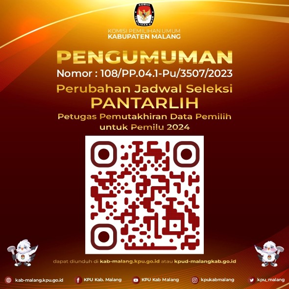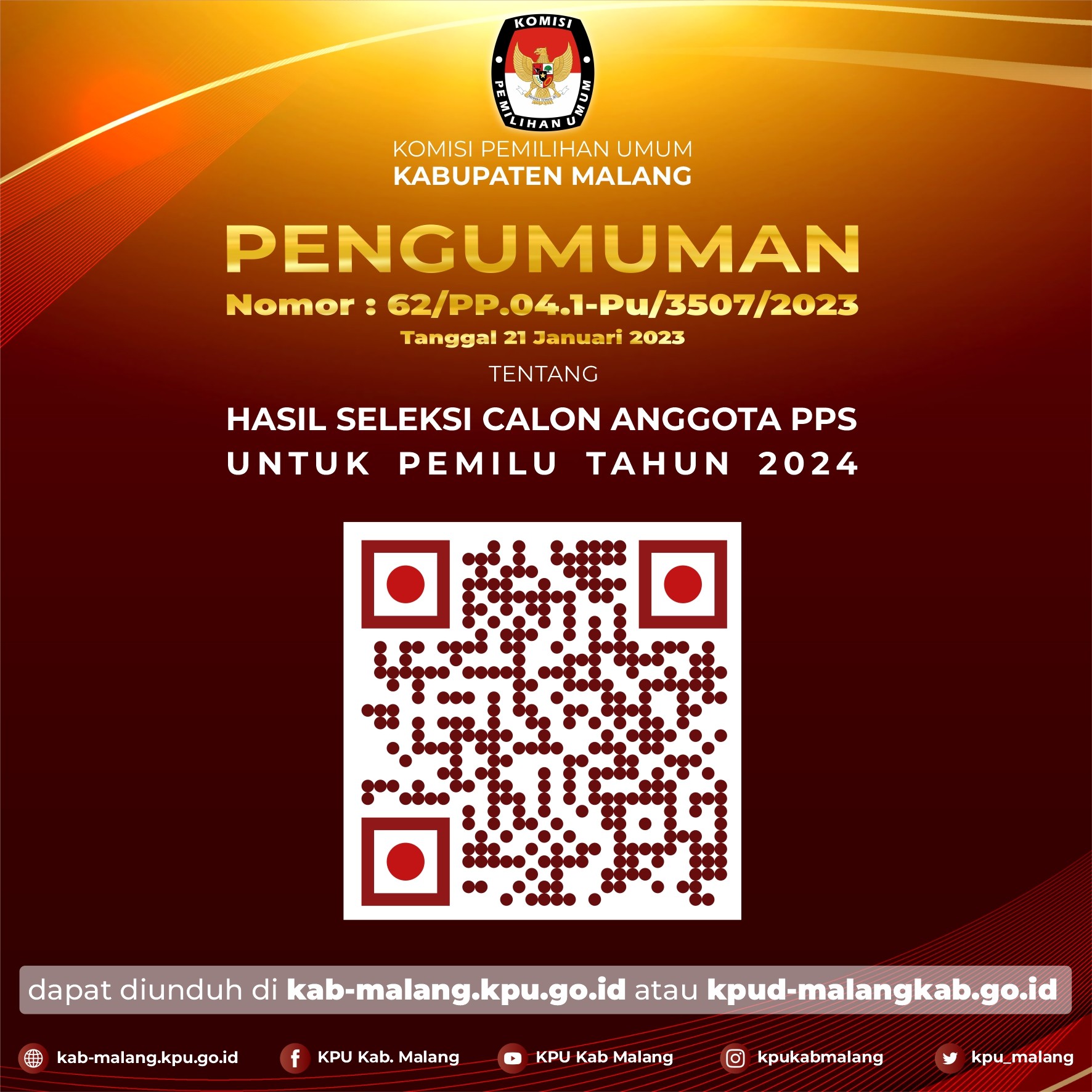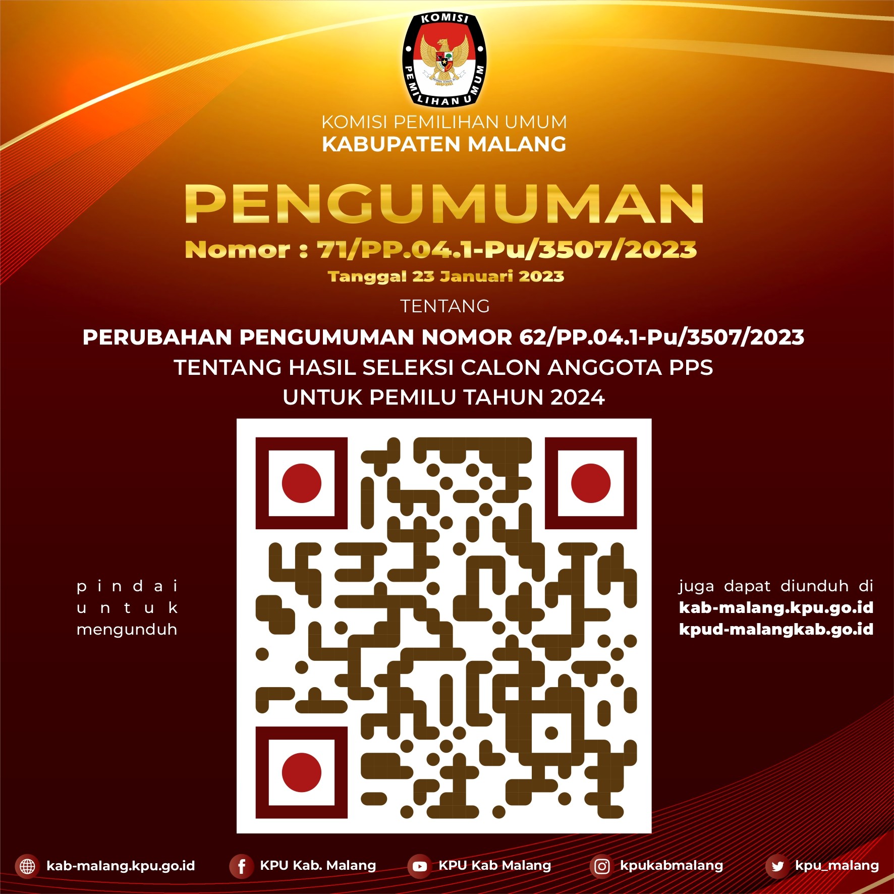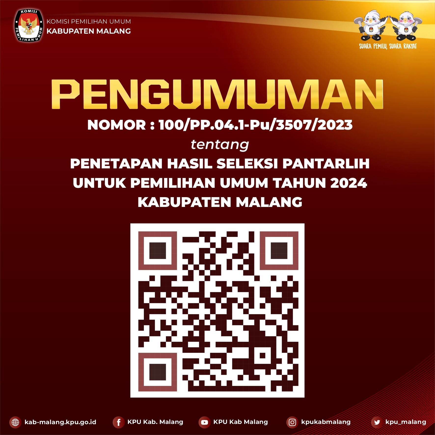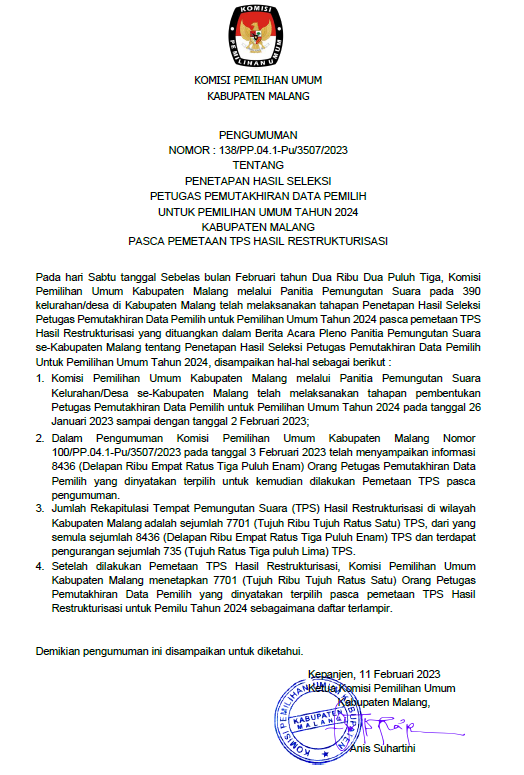 PENGUMUMAN NOMOR : 138/PP.04.1-Pu/3507/2023 TENTANG PENETAPAN HASIL SELEKSI PETUGAS PEMUTAKHIRAN DATA PEMILIH UNTUK PEMILIHAN UMUM TAHUN 2024 KABUPATEN MALANG PASCA PEMETAAN TPS HASIL RESTRUKTURISASI Pada hari Sabtu tanggal Sebelas bulan Februari tahun Dua Ribu Dua Puluh Tiga, Komisi Pemilihan Umum Kabupaten Malang melalui Panitia Pemungutan Suara pada 390 kelurahan/desa di Kabupaten Malang telah melaksanakan tahapan Penetapan Hasil Seleksi Petugas Pemutakhiran Data Pemilih untuk Pemilihan Umum Tahun 2024 pasca pemetaan TPS Hasil Restrukturisasi yang dituangkan dalam Berita Acara Pleno Panitia Pemungutan Suara se-Kabupaten Malang tentang Penetapan Hasil Seleksi Petugas Pemutakhiran Data Pemilih Untuk Pemilihan Umum Tahun 2024, disampaikan hal-hal sebagai berikut : 1. Komisi Pemilihan Umum Kabupaten Malang melalui Panitia Pemungutan Suara Kelurahan/Desa se-Kabupaten Malang telah melaksanakan tahapan pembentukan Petugas Pemutakhiran Data Pemilih untuk Pemilihan Umum Tahun 2024 pada tanggal 26 Januari 2023 sampai dengan tanggal 2 Februari 2023; 2. Dalam Pengumuman Komisi Pemilihan Umum Kabupaten Malang Nomor 100/PP.04.1-Pu/3507/2023 pada tanggal 3 Februari 2023 telah menyampaikan informasi 8436 (Delapan Ribu Empat Ratus Tiga Puluh Enam) Orang Petugas Pemutakhiran Data Pemilih yang dinyatakan terpilih untuk kemudian dilakukan Pemetaan TPS pasca pengumuman. 3. Setelah dilakukan Pemetaan TPS Hasil Restrukturisasi, Komisi Pemilihan Umum Kabupaten Malang menetapkan 7701 (Tujuh Ribu Tujuh Ratus Satu) Orang Petugas Pemutakhiran Data Pemilih yang dinyatakan terpilih pasca pemetaan TPS Hasil Restrukturisasi untuk Pemilu Tahun 2024 sebagaimana daftar terlampir. Demikian pengumuman ini disampaikan untuk diketahui. Kepanjen, 11 Februari 2023 Ketua Komisi Pemilihan Umum Kabupaten Malang, tertanda Anis Suhartini PENGUMUMAN PENETAPAN PANTARLIH HASIL RESTRUKTURISASI TPS dapat diunduh di sini