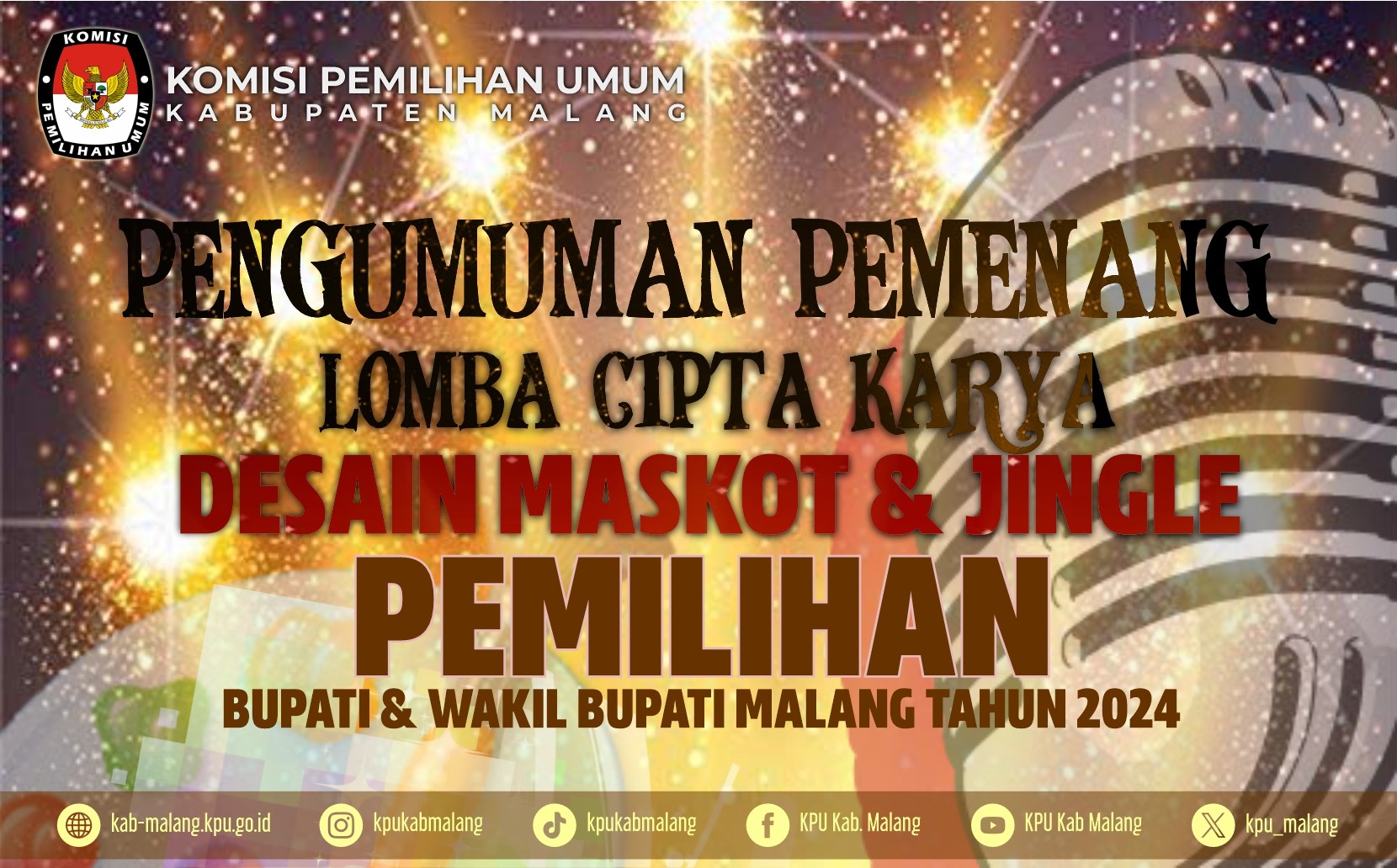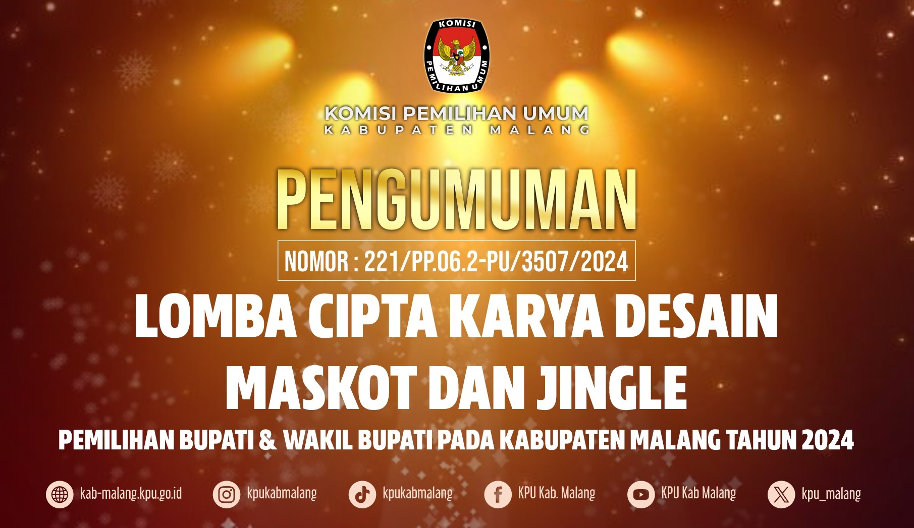 Dalam rangka mengoptimalkan pelaksanaan Sosialisasi Pemilihan Bupati dan Wakil Bupati pada Kabupaten Malang Tahun 2024, Komisi Pemilihan Umum Kabupaten Malang mengadakan Lomba Cipta Karya Desain Maskot dan Jingle Pemilihan Bupati dan Wakil Bupati pada Kabupaten Malang Tahun 2024 dengan ketentuan sebagai berikut :
