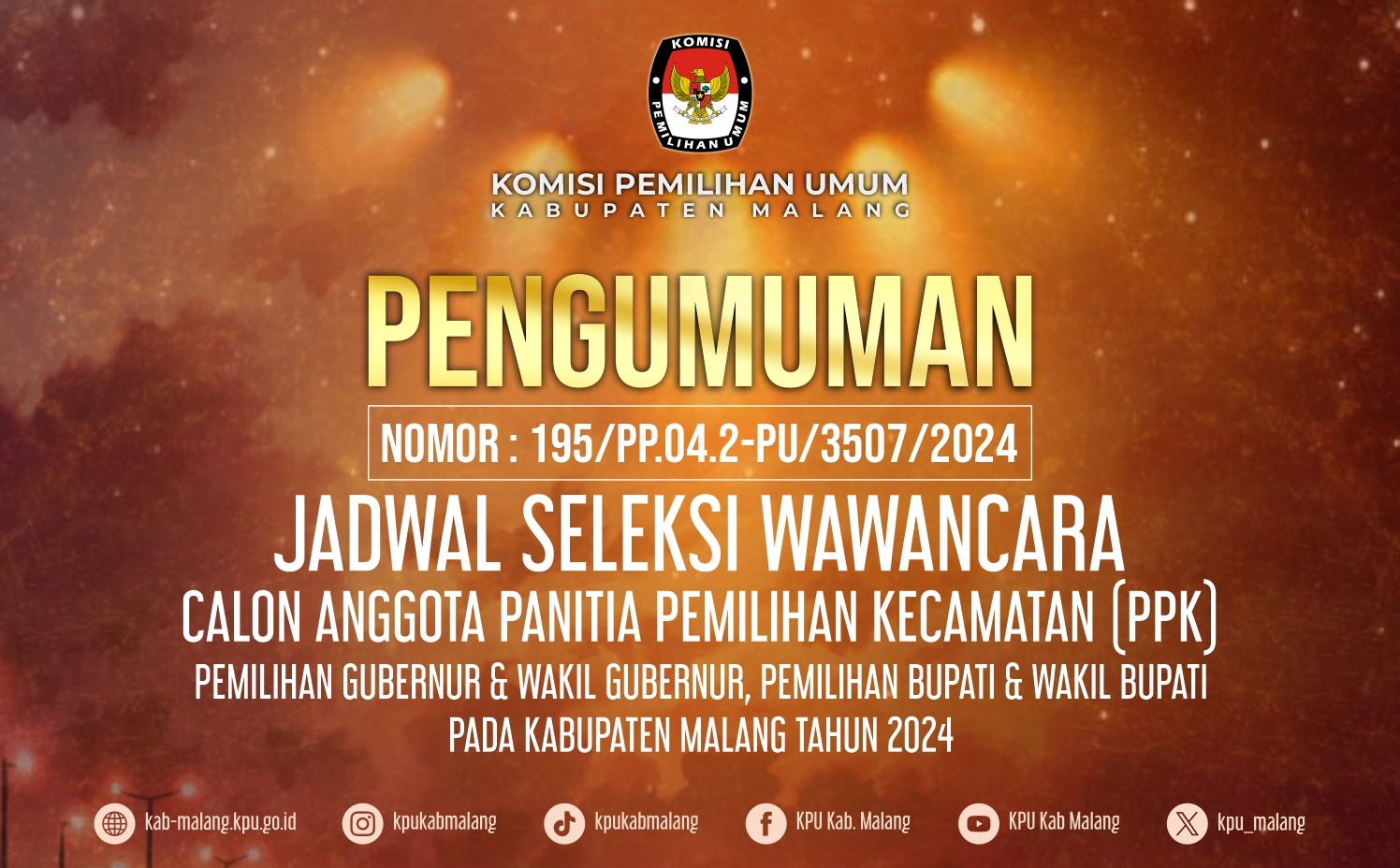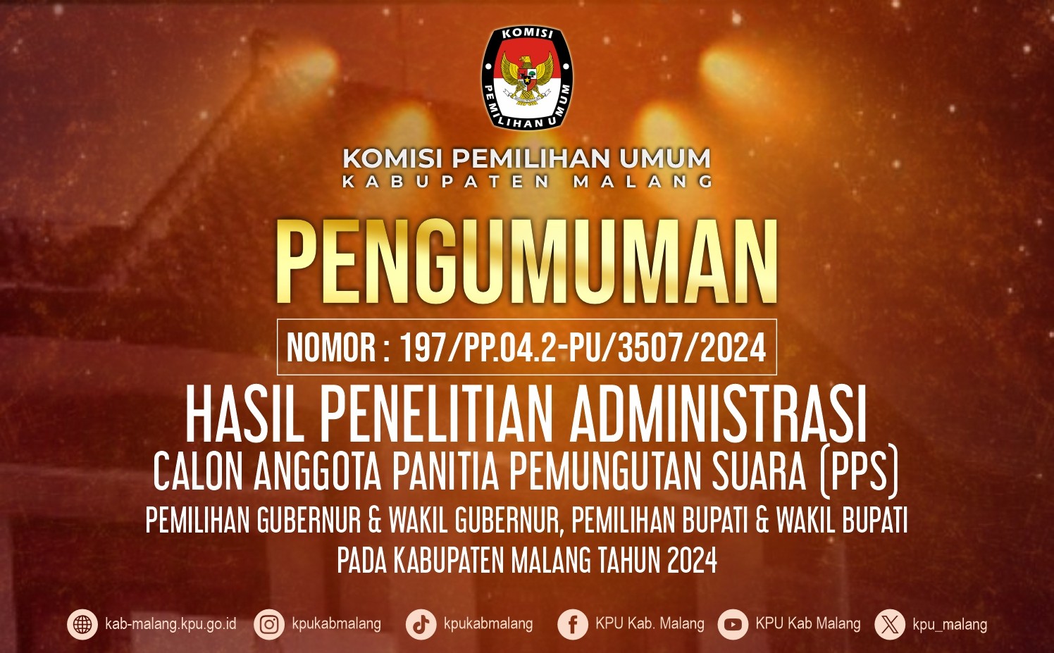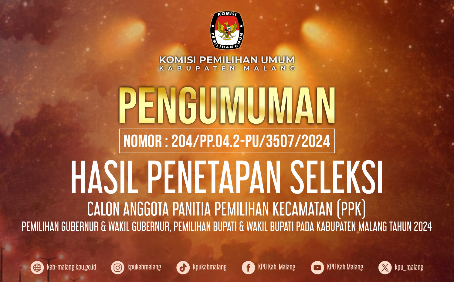PENGUMUMAN NOMOR : 197/PP.04.2-Pu/3507/2024 TENTANG HASIL PENELITIAN ADMINISTRASI CALON ANGGOTA PANITIA PEMUNGUTAN SUARA UNTUK PEMILIHAN GUBERNUR DAN WAKIL GUBERNUR, BUPATI DAN WAKIL BUPATI PADA KABUPATEN MALANG TAHUN 2024 Sehubungan dengan Komisi Pemilihan Umum Kabupaten Malang telah melaksanakan tahapan Penelitian Administrasi Calon Anggota Panitia Pemungutan Suara untuk Pemilihan Gubernur dan Wakil Gubernur, Bupati dan Wakil Bupati pada Kabupaten Malang Tahun 2024, disampaikan beberapa hal sebagai berikut: 1. Pelaksanaan Pendaftaran Calon Anggota Panitia Pemungutan Suara untuk Pemilihan Gubernur dan Wakil Gubernur, Bupati dan Wakil Bupati pada Kabupaten Malang Tahun 2024 telah dilaksanakan pada tanggal 2 Mei 2024 sampai dengan tanggal 8 Mei 2024 dan Pelaksanaan Perpanjangan Pendaftaran Calon Anggota Panitia Pemungutan Suara untuk Pemilihan Gubernur dan Wakil Gubernur, Bupati dan Wakil Bupati pada Kabupaten Malang Tahun 2024 telah dilaksanakan pada tanggal 9 Mei 2024 sampai dengan tanggal 11 Mei 2024. 2. Penelitian Administrasi Calon Anggota Panitia Pemungutan Suara untuk Pemilihan Gubernur dan Wakil Gubernur, Bupati dan Wakil Bupati pada Kabupaten Malang Tahun 2024 telah dilaksanakan pada tanggal 3 Mei 2024 sampai dengan tanggal 12 Mei 2024 bertempat di Kantor Komisi Pemilihan Umum Kabupaten Malang. 3. KPU Kabupaten Malang menetapkan hasil seleksi administrasi pembentukan Panitia Pemungutan Suara untuk Pemilihan Gubernur dan Wakil Gubernur, Bupati dan Wakil Bupati pada Kabupaten Malang Tahun 2024 sebagaimana daftar terlampir. 4. Sehubungan dengan hal tersebut di atas, Komisi Pemilihan Umum Kabupaten Malang mengundang calon anggota Panitia Pemungutan Suara yang dinyatakan Memenuhi Syarat untuk hadir dan mengikuti Seleksi Tertulis Calon Anggota Panitia Pemungutan Suara pada : Hari, Tanggal : Sabtu, 18 Mei 2024 Pukul : 08.00 WIB s/d selesai Tempat : tersebar di 11 titik kecamatan se-wilayah Kabupaten Malang Pakaian : Atasan kemeja warna putih, bawahan warna hitam dan Bersepatu Detail pembagian tempat pelaksanaan dan peserta akan diinformasikan lebih lanjut melalui website KPU Kabupaten Malang di https://kab-malang.kpu.go.id atau https://kpud-malangkab.go.id ; 5. Calon Anggota Panitia Pemungutan Suara mengikuti seleksi tertulis dengan ketentuan : a. Membawa Tanda Bukti Terdaftar sebagai calon anggota PPS dan KTP elektronik; b. Bagi yang belum menyerahkan Dokumen Persyaratan dalam bentuk fisik atau hardcopy, agar dapat disampaikan pada saat sebelum pelaksanaan tes tertulis; c. Membawa Alat Tulis Sendiri; d. Hadir tepat waktu di lokasi seleksi tertulis dan melakukan registrasi paling lambat 30 menit sebelum dimulai waktu ujian; e. Peserta dihimbau tidak membawa dan/atau mengenakan perhiasan atau aksesoris; f. Bagi peserta yang terlambat hadir, tidak ada waktu tambahan dalam proses penyelesaian soal yang diujikan. 6. Komisi Pemilihan Umum Kabupaten Malang membuka tanggapan dan masukan bagi masyarakat terhadap calon Calon Anggota Panitia Pemungutan Suara sejak tanggal 13 Mei 2024 sampai dengan tanggal 20 Mei 2024. 7. Informasi lebih lanjut perihal pelaksanaan seleksi tertulis dan tanggapan dan masukan masyarakat dapat disampaikan melalui Sekretariat KPU Kabupaten Malang Alamat : Jalan Panji Nomor 119, Kepanjen Kontak : 081334433119 Demikian pengumuman ini disampaikan, untuk diketahui. Kepanjen, 13 Mei 2024 Ketua KPU Kabupaten Malang ttd (Anis Suhartini) PENGUMUMAN HASIL PENELITIAN ADMINISTRASI CALON ANGGOTA PPS UNTUK PILKADA MALANG TAHUN 2024 dapat diunduh di sini
