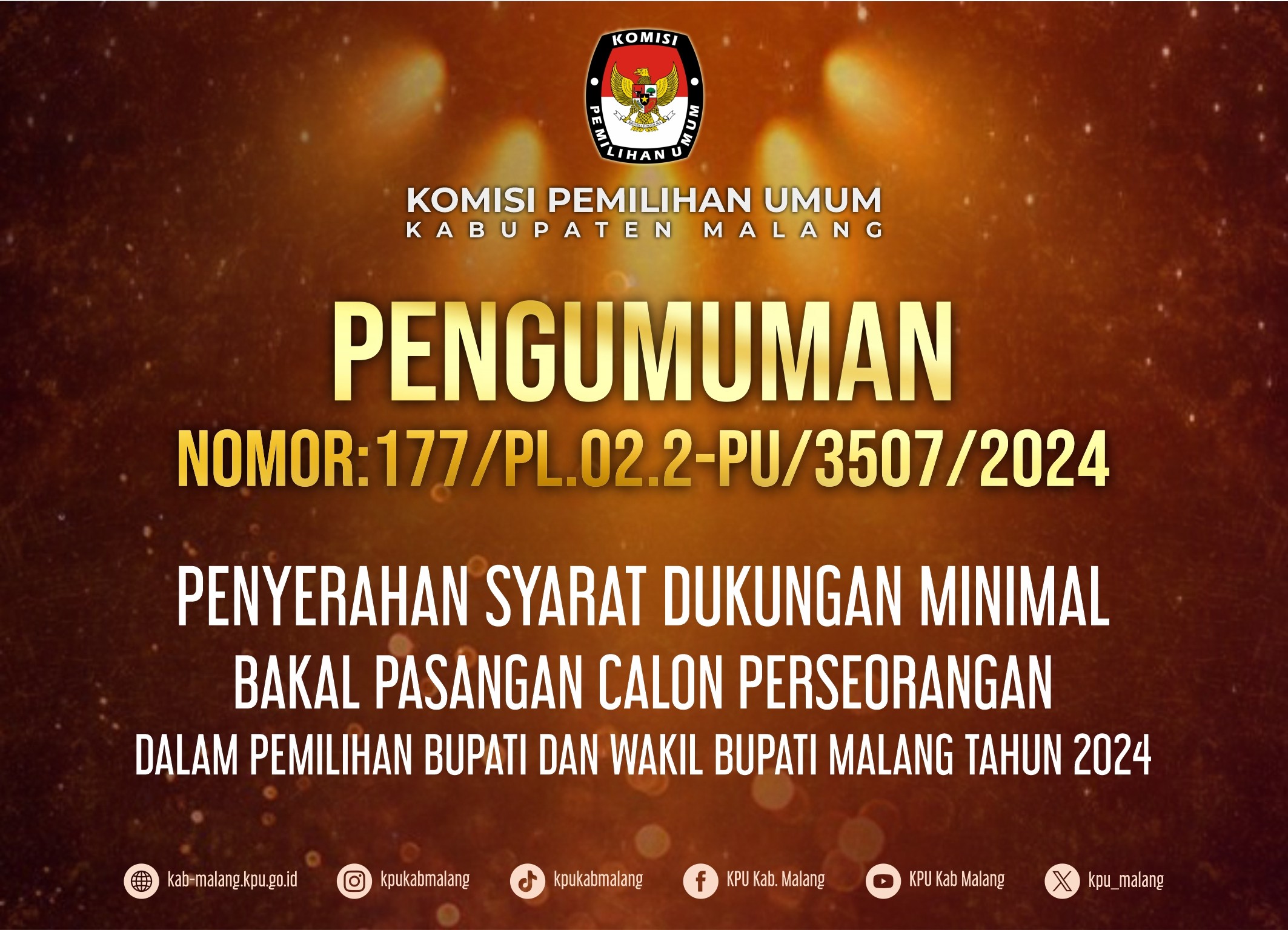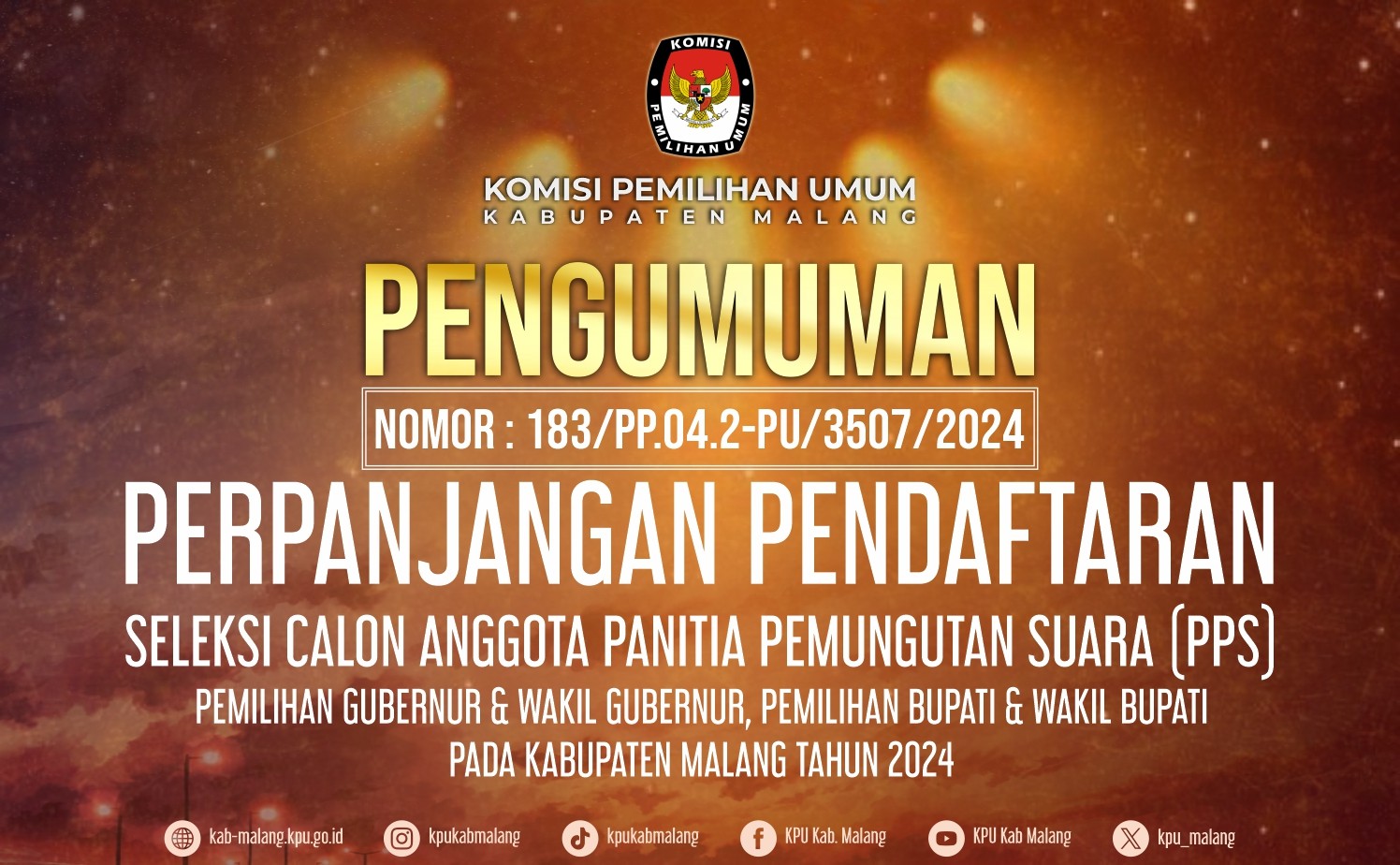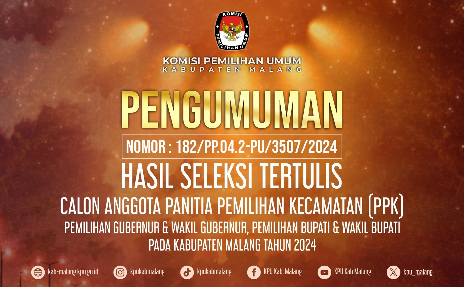 PENGUMUMAN NOMOR : 197/PP.04.2-Pu/3507/2024 TENTANG HASIL PENELITIAN ADMINISTRASI CALON ANGGOTA PANITIA PEMUNGUTAN SUARA UNTUK PEMILIHAN GUBERNUR DAN WAKIL GUBERNUR, BUPATI DAN WAKIL BUPATI PADA KABUPATEN MALANG TAHUN 2024 Sehubungan dengan Komisi Pemilihan Umum Kabupaten Malang telah melaksanakan tahapan Penelitian Administrasi Calon Anggota Panitia Pemungutan Suara untuk Pemilihan Gubernur dan Wakil Gubernur, Bupati dan Wakil Bupati pada Kabupaten Malang Tahun 2024, disampaikan beberapa hal sebagai berikut: 1. Pelaksanaan Pendaftaran Calon Anggota Panitia Pemungutan Suara untuk Pemilihan Gubernur dan Wakil Gubernur, Bupati dan Wakil Bupati pada Kabupaten Malang Tahun 2024 telah dilaksanakan pada tanggal 2 Mei 2024 sampai dengan tanggal 8 Mei 2024 dan Pelaksanaan Perpanjangan Pendaftaran Calon Anggota Panitia Pemungutan Suara untuk Pemilihan Gubernur dan Wakil Gubernur, Bupati dan Wakil Bupati pada Kabupaten Malang Tahun 2024 telah dilaksanakan pada tanggal 9 Mei 2024 sampai dengan tanggal 11 Mei 2024. 2. Penelitian Administrasi Calon Anggota Panitia Pemungutan Suara untuk Pemilihan Gubernur dan Wakil Gubernur, Bupati dan Wakil Bupati pada Kabupaten Malang Tahun 2024 telah dilaksanakan pada tanggal 3 Mei 2024 sampai dengan tanggal 12 Mei 2024 bertempat di Kantor Komisi Pemilihan Umum Kabupaten Malang. 3. KPU Kabupaten Malang menetapkan hasil seleksi administrasi pembentukan Panitia Pemungutan Suara untuk Pemilihan Gubernur dan Wakil Gubernur, Bupati dan Wakil Bupati pada Kabupaten Malang Tahun 2024 sebagaimana daftar terlampir. 4. Sehubungan dengan hal tersebut di atas, Komisi Pemilihan Umum Kabupaten Malang mengundang calon anggota Panitia Pemungutan Suara yang dinyatakan Memenuhi Syarat untuk hadir dan mengikuti Seleksi Tertulis Calon Anggota Panitia Pemungutan Suara pada : Hari, Tanggal : Sabtu, 18 Mei 2024 Pukul : 08.00 WIB s/d selesai Tempat : tersebar di 11 titik kecamatan se-wilayah Kabupaten Malang Pakaian : Atasan kemeja warna putih, bawahan warna hitam dan Bersepatu Detail pembagian tempat pelaksanaan dan peserta akan diinformasikan lebih lanjut melalui website KPU Kabupaten Malang di https://kab-malang.kpu.go.id atau https://kpud-malangkab.go.id ; 5. Calon Anggota Panitia Pemungutan Suara mengikuti seleksi tertulis dengan ketentuan : a. Membawa Tanda Bukti Terdaftar sebagai calon anggota PPS dan KTP elektronik; b. Bagi yang belum menyerahkan Dokumen Persyaratan dalam bentuk fisik atau hardcopy, agar dapat disampaikan pada saat sebelum pelaksanaan tes tertulis; c. Membawa Alat Tulis Sendiri; d. Hadir tepat waktu di lokasi seleksi tertulis dan melakukan registrasi paling lambat 30 menit sebelum dimulai waktu ujian; e. Peserta dihimbau tidak membawa dan/atau mengenakan perhiasan atau aksesoris; f. Bagi peserta yang terlambat hadir, tidak ada waktu tambahan dalam proses penyelesaian soal yang diujikan. 6. Komisi Pemilihan Umum Kabupaten Malang membuka tanggapan dan masukan bagi masyarakat terhadap calon Calon Anggota Panitia Pemungutan Suara sejak tanggal 13 Mei 2024 sampai dengan tanggal 20 Mei 2024. 7. Informasi lebih lanjut perihal pelaksanaan seleksi tertulis dan tanggapan dan masukan masyarakat dapat disampaikan melalui Sekretariat KPU Kabupaten Malang Alamat : Jalan Panji Nomor 119, Kepanjen Kontak : 081334433119 Demikian pengumuman ini disampaikan, untuk diketahui. Kepanjen, 13 Mei 2024 Ketua KPU Kabupaten Malang ttd (Anis Suhartini) PENGUMUMAN HASIL PENELITIAN ADMINISTRASI CALON ANGGOTA PPS UNTUK PILKADA MALANG TAHUN 2024 dapat diunduh di sini