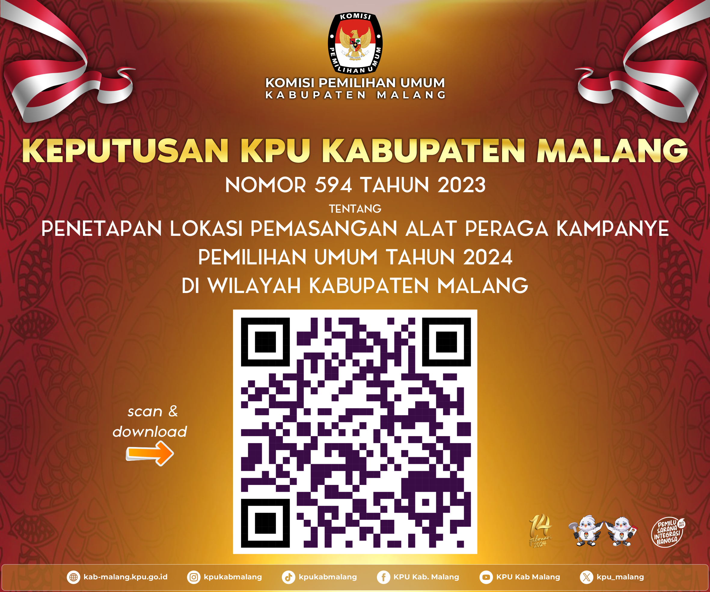 KEPUTUSAN KPU KAB. MALANG NOMOR 594 TAHUN 2023 TENTANG PENETAPAN LOKASI PEMASANGAN APK PEMILU TAHUN 2024 DI WILAYAH KAB. MALANG dapat diunduh di sini