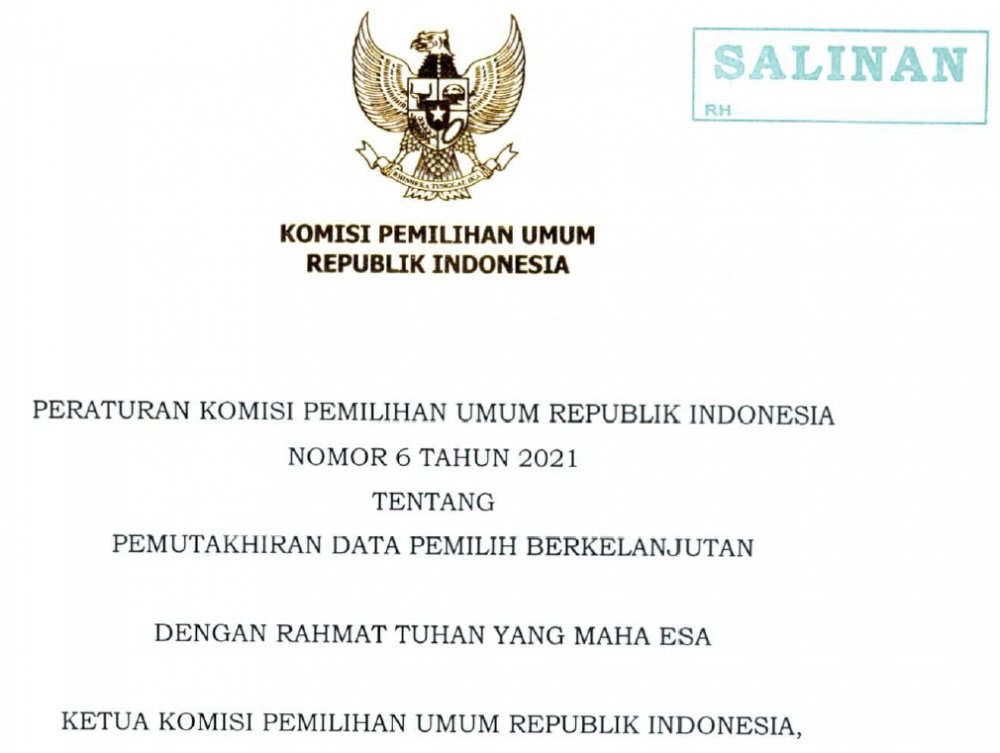 PKPU Nomor 6 Tahun 2021 Tentang Pemutakhiran Data Pemilih Berkelanjutan dapat diunduh di sini